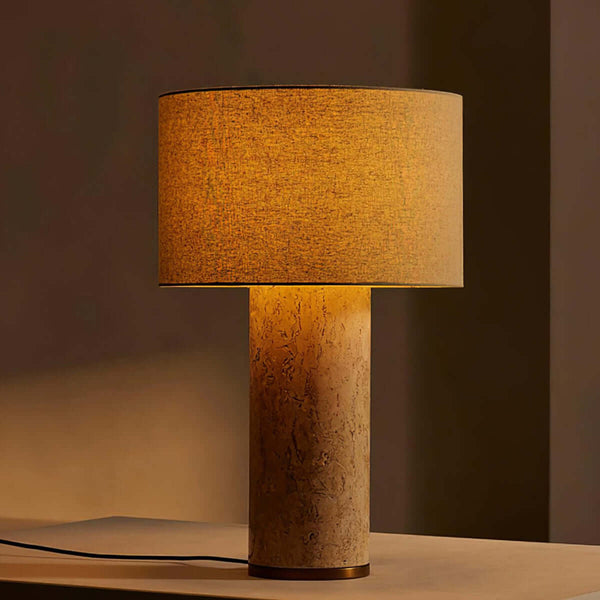 The Aria Table Lamp blends low-key elegance with a travertine-textured base and soft linen shade. Featuring a unique hole detail, it adds implicit beauty and calming light to boutique bedrooms and serene spaces. A decorative lamp made for refined, natural charm.